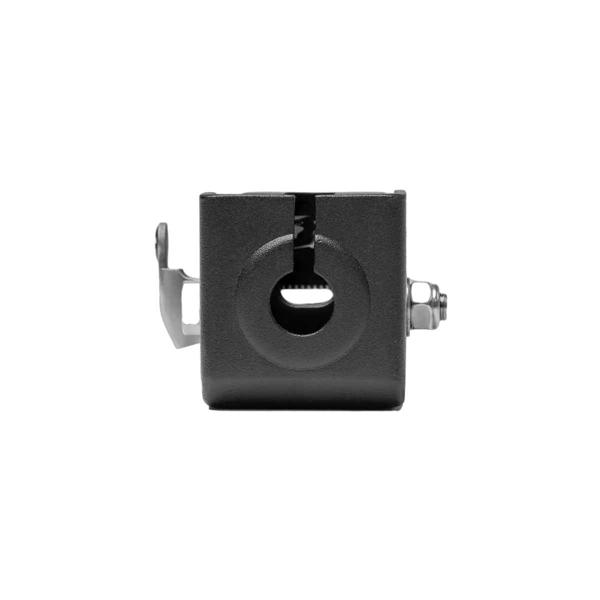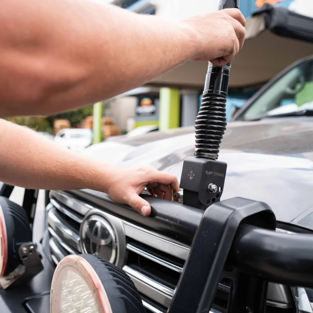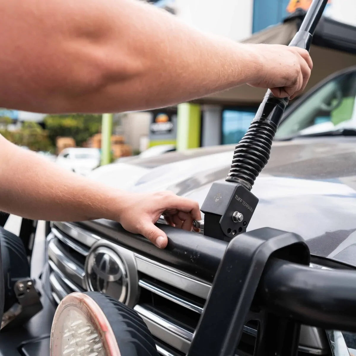 The Tuff Terrain Folding Antenna Bracket V2 holds your UHF or CB antenna solid on the bull bar while still dropping down for car parks and low branches. The hinge locks into four positions at 30-degree steps, meaning you can run the antenna upright on the highway then tip it down around town. The cable runs through the body, which keeps the lead tucked away from sharp edges and snags.