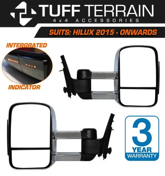 The chrome housings and solid mounting bases are built tough for regular towing, ready to go the distance on corrugated roads and highway runs. Electric adjustment hooks into the Hilux factory controls, a smart buy that keeps the cabin setup familiar. Integrated smoke lens indicators sit outboard on the casing, making your signals stand out to other drivers around campsites and busy holiday routes. Terms and conditions apply.